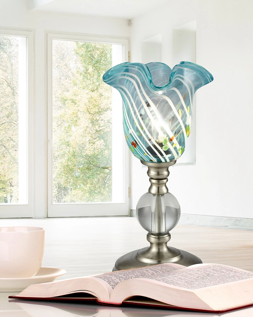 - This lovely Blue Uplit Accent Lamps vintage style and modern accents make it the perfect solution for almost any lighting need. The fixture features a beautiful uplit ruffled tulip shade with a blue background accented with white swirls and multicolored