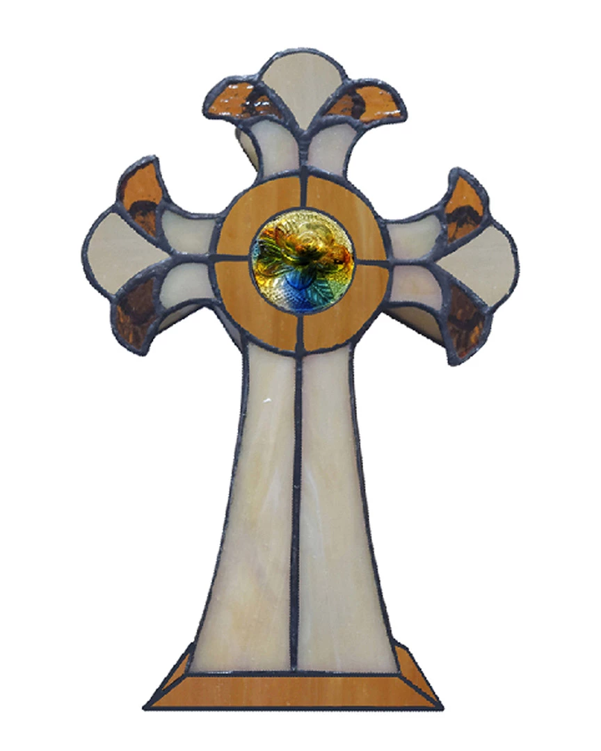 - Our Tiffany Cross Accent Lamp is a divine addition to any decor that does double duty as both functional accent lamp and illuminated work of art. The highly stylized cross features a base of swirled amber art glass that is accented with deep filigree. At
