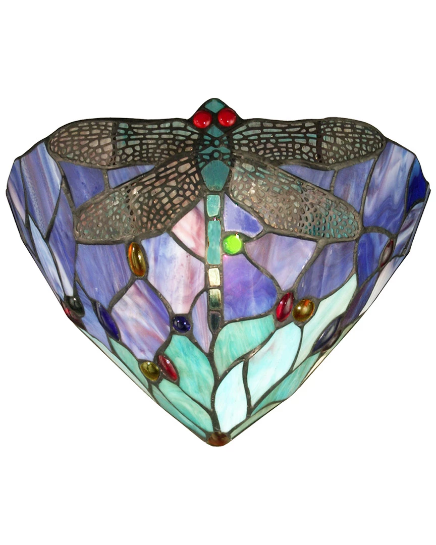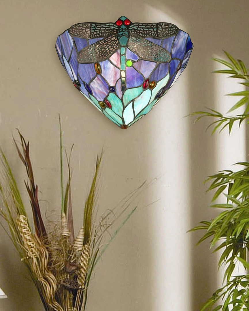 - Brilliantly resplendent, the vivid jewel tones in this sconce will add rich color when the fixture is illuminated. Large dragonflies in green and blue, complete with crimson art glass eyes are set against a slate pattern in vibrant shades of blue, purple,