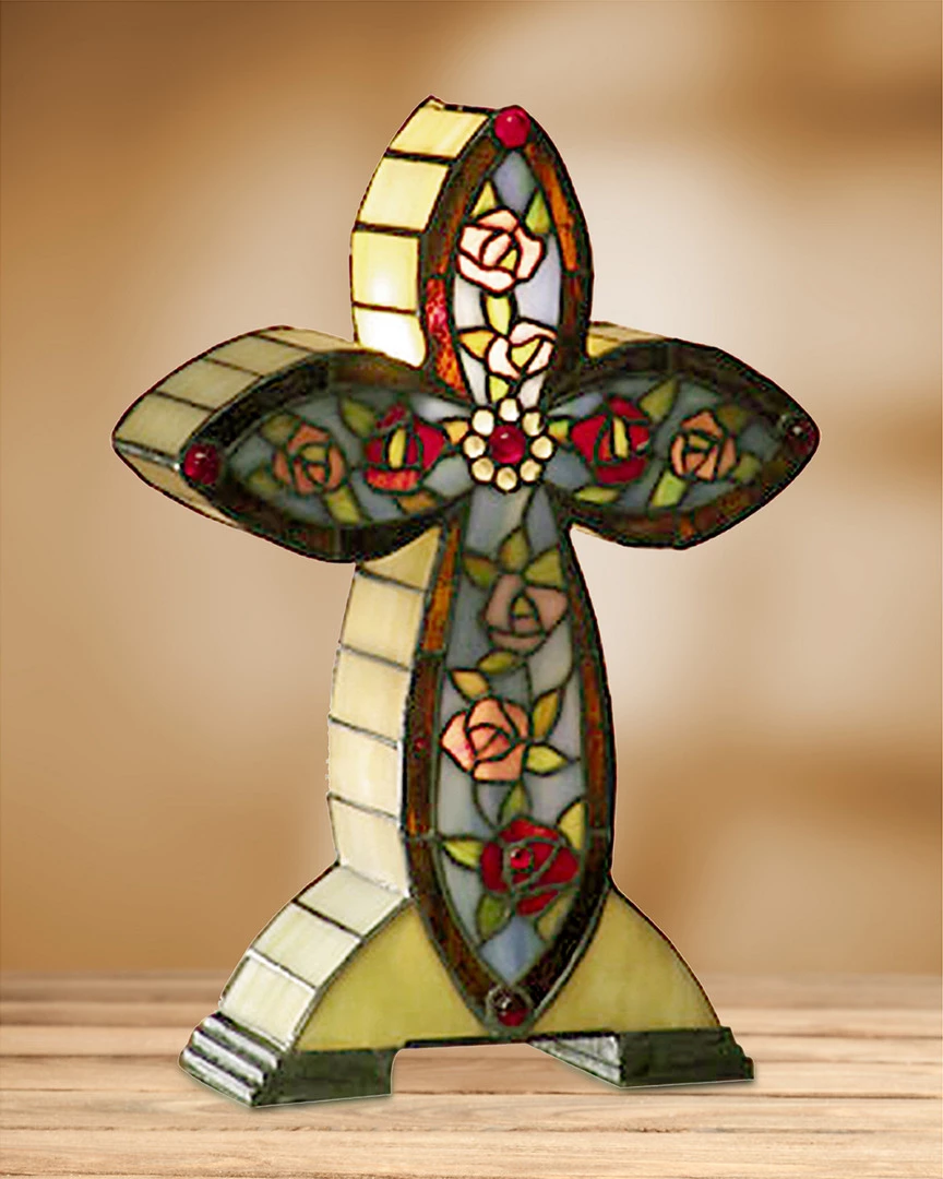 - Red and pink roses are featured on the Flaura Accent Cross accent lamp. Art glass edges trim the cream body panels and will glow brilliantly when the lamp is lit. The accent lamp is beautifully embellished with red jewels for added color. This accent lamp