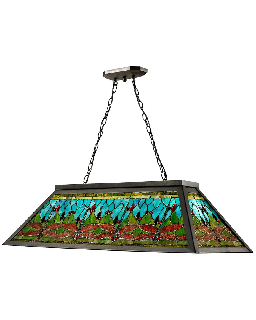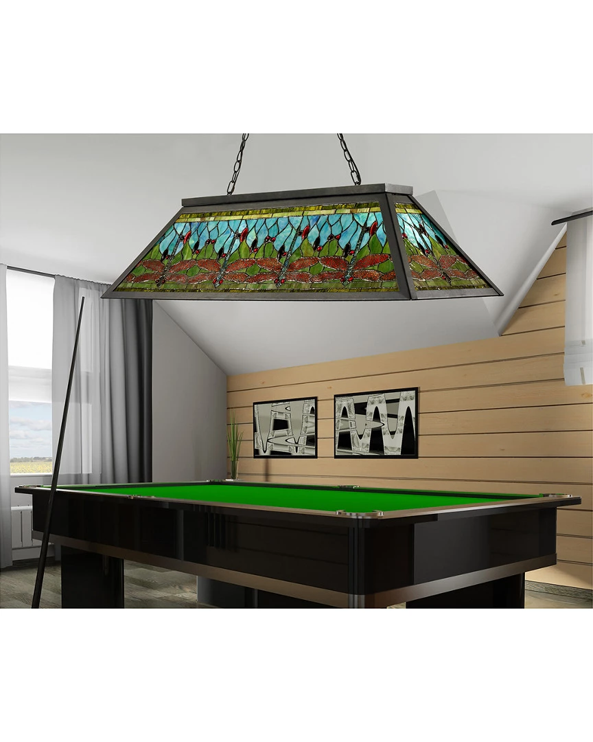 - A background of cool green and blue provides the perfect setting for deep red dragonflies in our Glade pool table fixture.508 pieces of art glass in total, each piece is individually hand rolled and copper foiled using the same technique first developed b