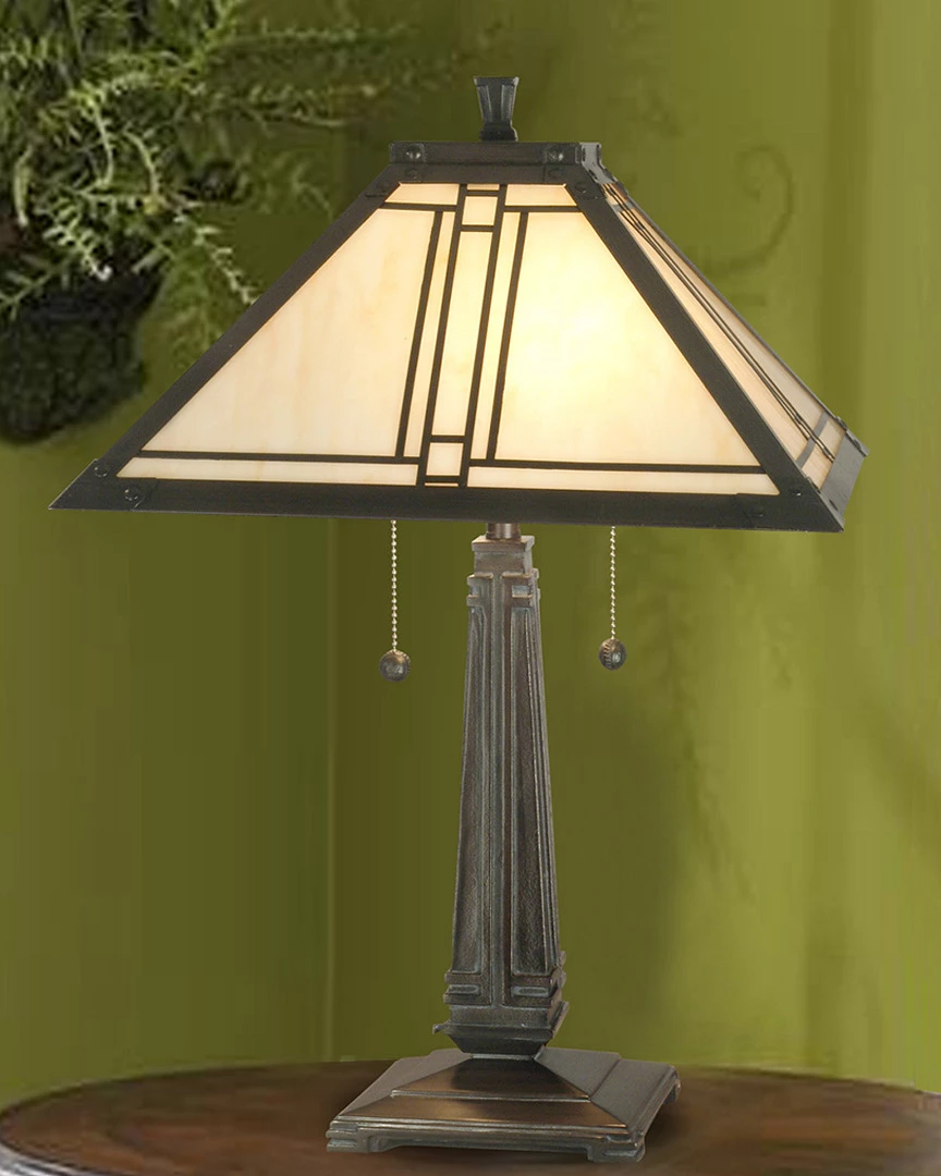 - The clean, uncluttered lines of this table lamp will beautifully accentuate your home or office. Classically mission in style, the square shade features 64 pieces of creamy light amber art glass. A bold filigree overlay, featuring mission inspired geometr
