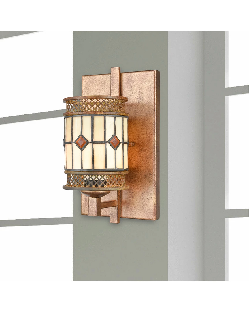 - The Minerals Tiffany Wall Sconce will fashionably complement any decor in your home or office. The shade colors of light amber and beige accented with amber geometric shapes blend perfectly with a rustic bronze metal mesh design fixture. Timeless hand rol