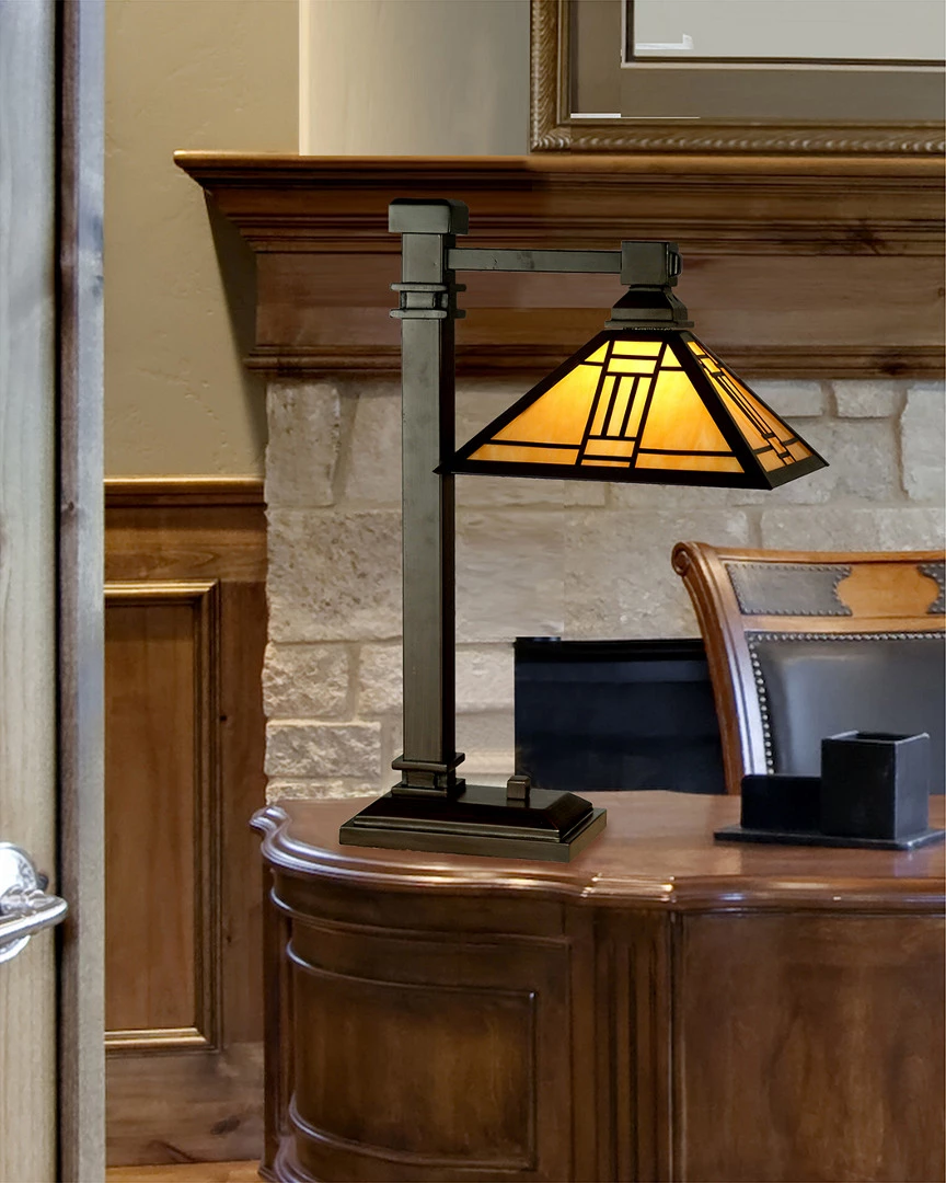 - Perfect for a den, study or office, the bold, rugged style of this bridge style table lamp will quickly become one of your favorites. The square mission shade is shimmering amber and is overlaid with a traditional mission style vertical design. The strong