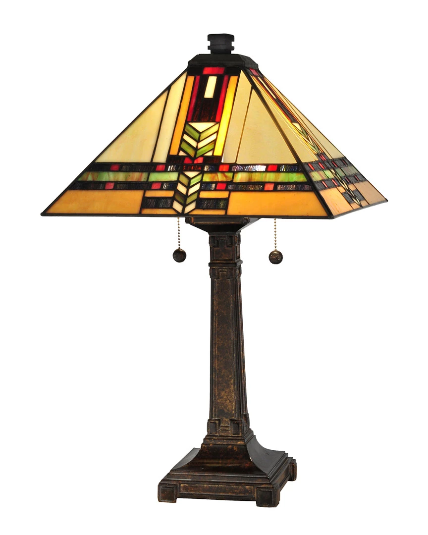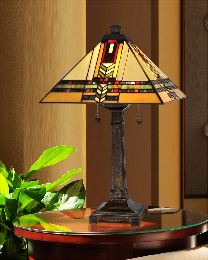 - A kaleidoscope of mission-inspired color makes our Palo Mission table lamp a welcome addition to your home or office. The square shade features a base color of light and medium amber art glass panels. A vertical band of arrowheads in green and amber is su