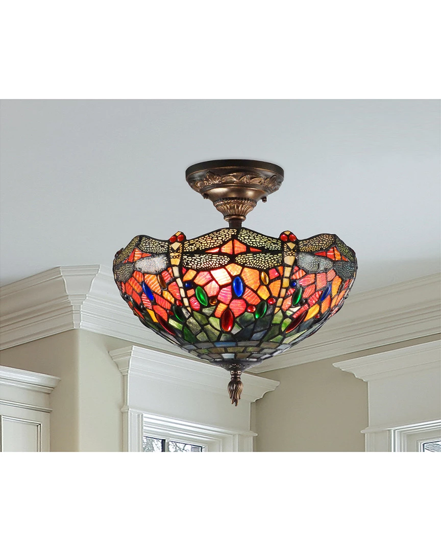 - Tiffanys iconic dragonflies plus glass jewels in a kaleidoscope of colors equal blazing beauty in or Sonota semi flush mount fixture. 420 pieces of art glass form a burning background of red, orange and yellow. Green, blue, red, orange, and amber art gla