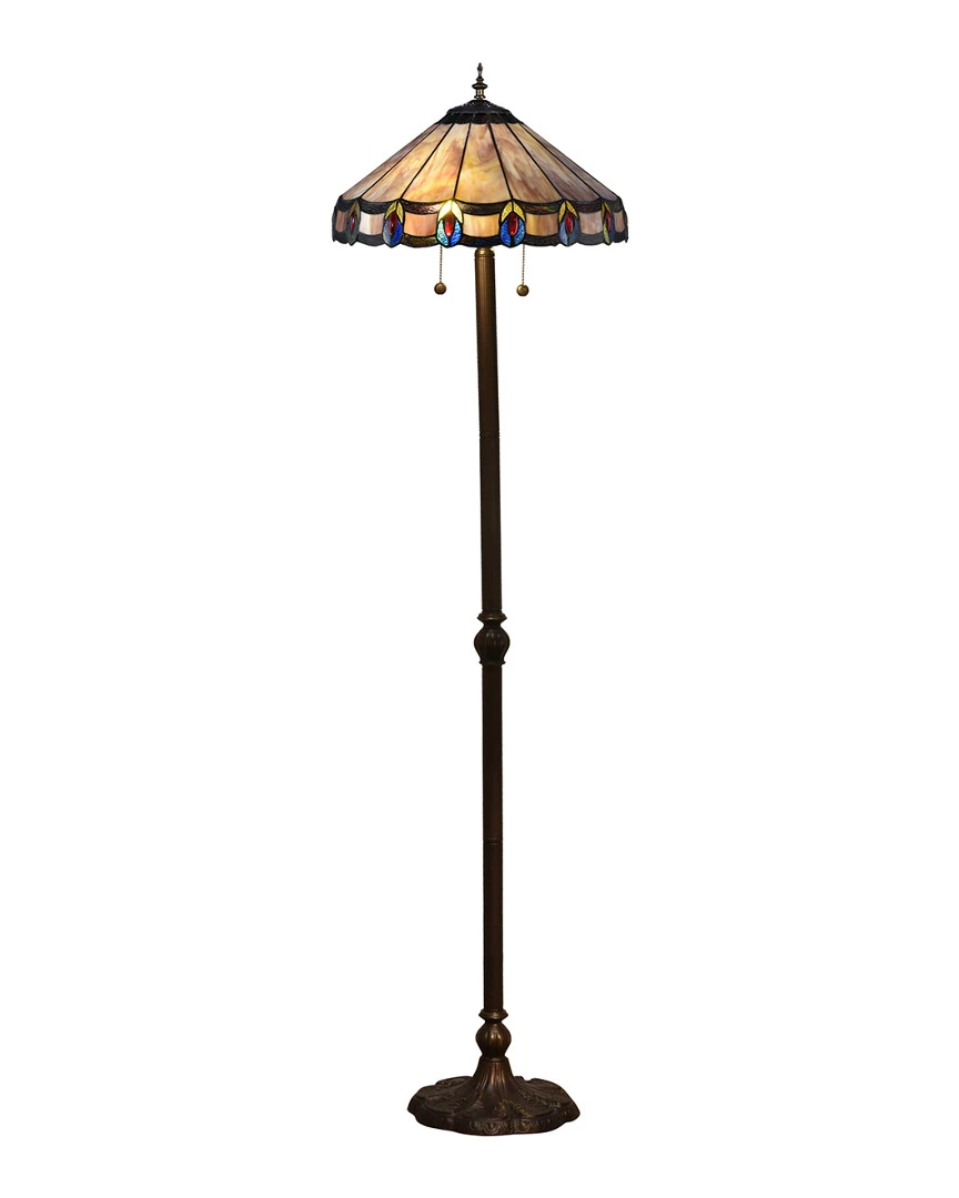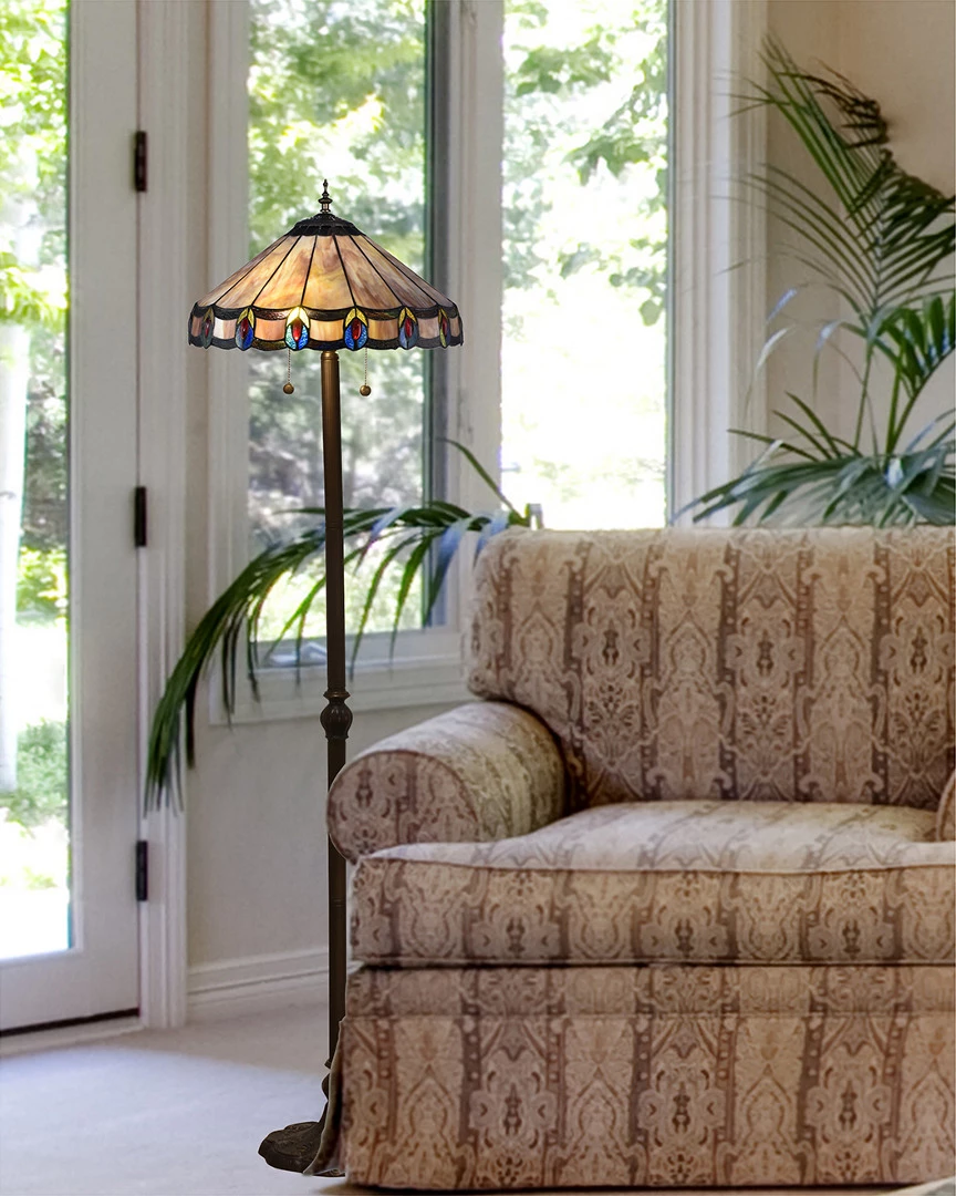 - The colorful warmth of our Townsville Floor Lamp make it the perfect focal point in any room in your home. The tall fixture features a conical shade crafted of art glass pieces set in a wedge pattern. The bottom edge is bordered top and bottom by draped b